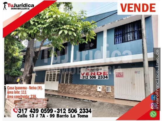 Se vende espectacular casa comercial habitacional (Renta), ubicada en la ciudad de Neiva (Huila-Col), cerca de Supermercados de cadena, centro Comercial Santa Lucia, Colegios, universidades, restaurantes, GYM, condominio y conjuntos cerrados  y comercio en general; a 15 minutos del centro de Neiva.