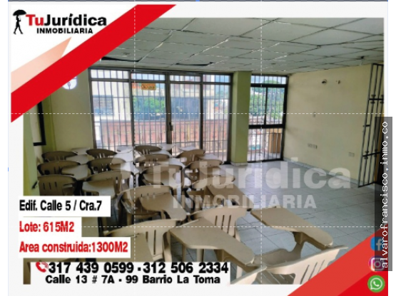 Se arrienda este edificio el cual es una oportunidad de inversión en la ciudad de Neiva (H) Colombia; ubicado en la calle 5 entre las carreras 7 y 8. El inmueble (Lote) cuenta con un área 615 m2, con un edificio de dos (2) torres con un área construida de 1.300 m2; consta de 4 pisos. Cuenta el inmueble con proyección a 2 torres más. La edificación de 4 pisos actualmente esta diseñada para uso institucional (educación) 10 salones y una área de oficinas en el primer (1) piso, salón para cafetería y cocina integral, zona verde y patio. El inmueble posee cumplimiento a todos los parámetros normativos y legales.